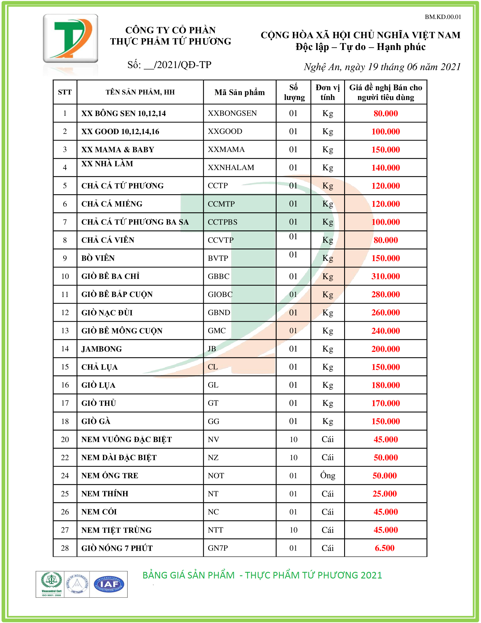 Cập nhật bảng giá các sản phẩm tại Tứ Phương mới nhất 2021 để người tiêu dùng nhận biết và được mua hàng đúng giá.