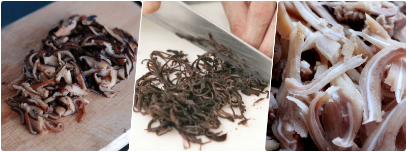 - Nấm mèo hay còn được gọi là mộc nhĩ: nếu là mộc nhĩ tươi, bạn có thể rửa sạch, cắt bỏ phần cuống. Còn nếu là mộc nhĩ khô thì bạn nên ngâm vào nước ấm 60 – 65 độ C trong khoảng 10 – 15 phút cho nở hết trước khi cắt bỏ phần chân. Sau đó, đem nấm đã rửa sạch đem đi thái nhỏ thành sợi.