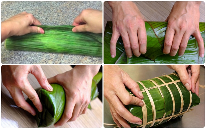 - Dùng dây lạt gói chặt các cạnh của lá chuối và định hình sao cho quả giò không bị xô lệch và méo.