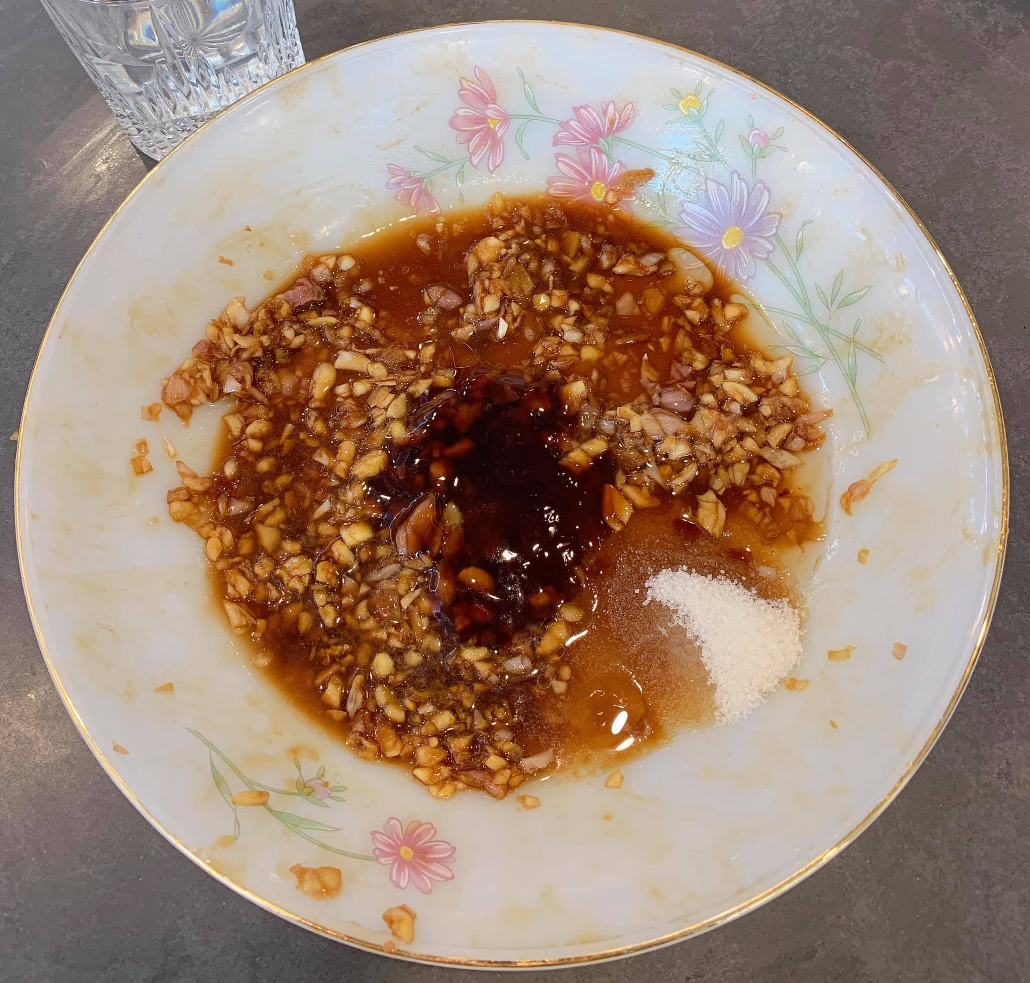 2. Trần vào nước sôi rồi rửa sạch lại, đừng luộc chín nhé. Sườn sau khi trần ướp với: Tỏi băm, hành khô, 3 thìa xì dầu, 2 thìa dầu hào, 1 thìa dấm. Ướp trong 30 phút