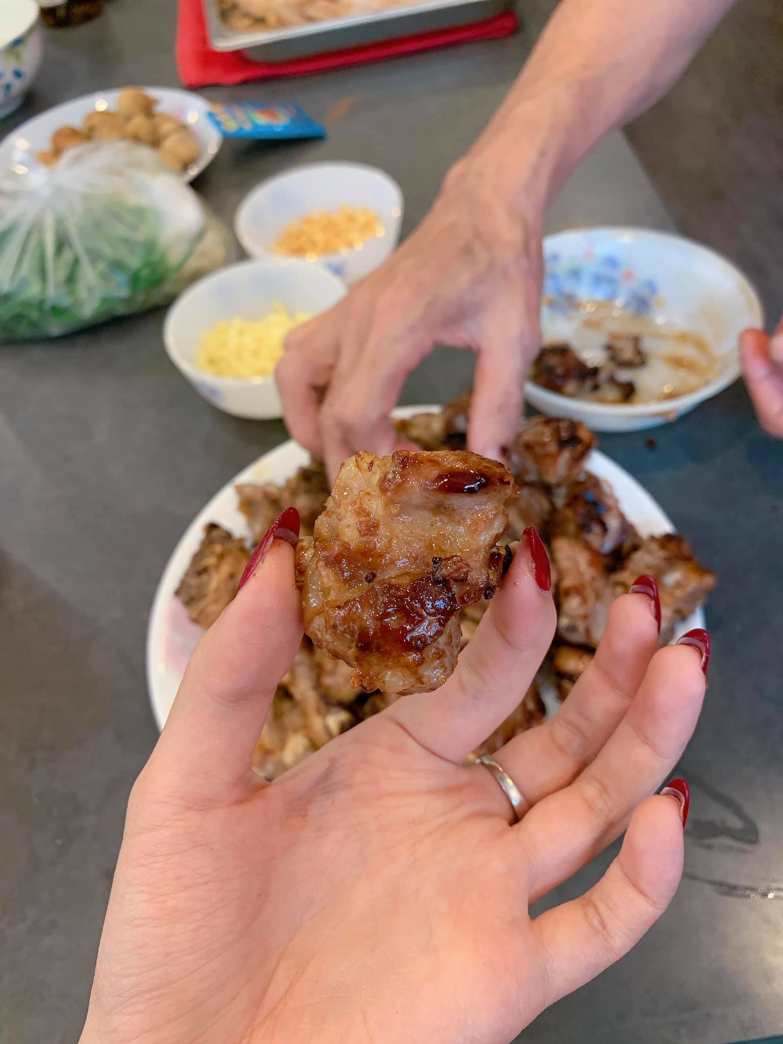 Nên bước này rán nhanh tay chú ý kẻo xườn cháy nhé vì có xì dầu ngọt dễ cháy. Nếu rán lửa nhỏ thì mặt xườn lâu vàng và khô nhanh.