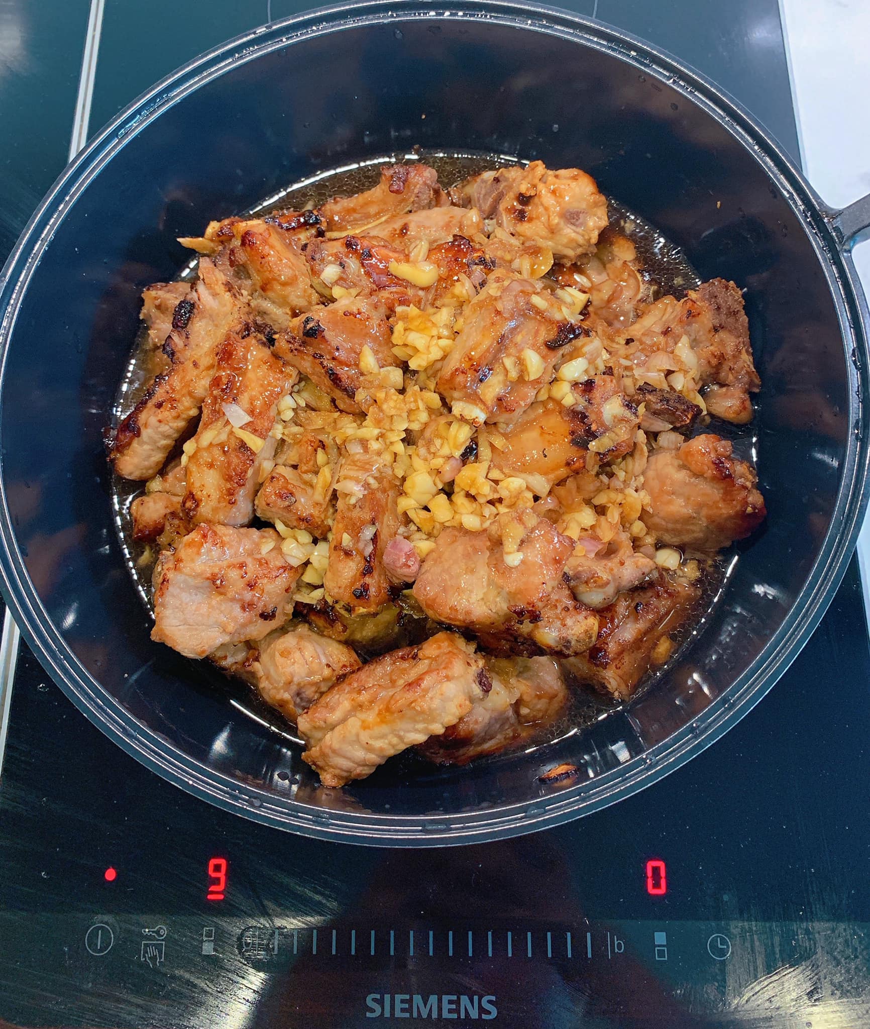 Sau khi đun gắp sườn ra đĩa và đổ nước sốt lên, rắc tỏi lên. Các chế thử tưởng tượng cảnh bát cơm nóng hổi ăn cùng miếng sườn này rồi nhai cả miếng tỏi giòn tan trog miệng thì 5 bát cơm cũng hết :))