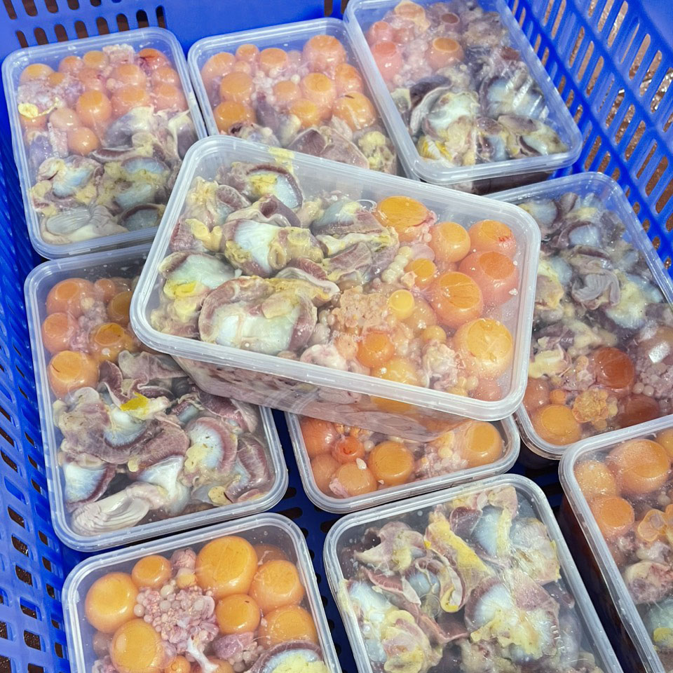 Trứng: mặt hàng tươi , số lượng có hạn. Bên cạnh đó còn có các mặt hàng tràng, tim, mề. Có thể chế biến thành nhiều món khác nhau.