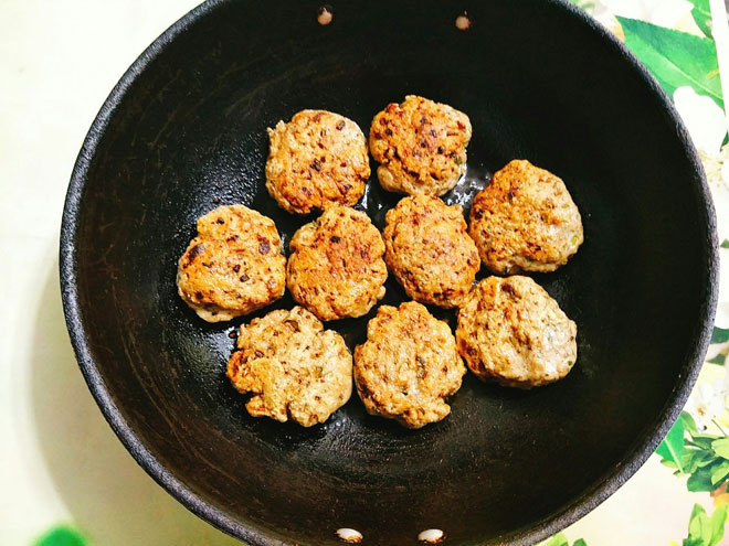 Cho lượng dầu tương đối vào chảo đun cho dầu nóng thì gắp chả vào chiên tới khi 2 mặt miếng chả chín vàng.