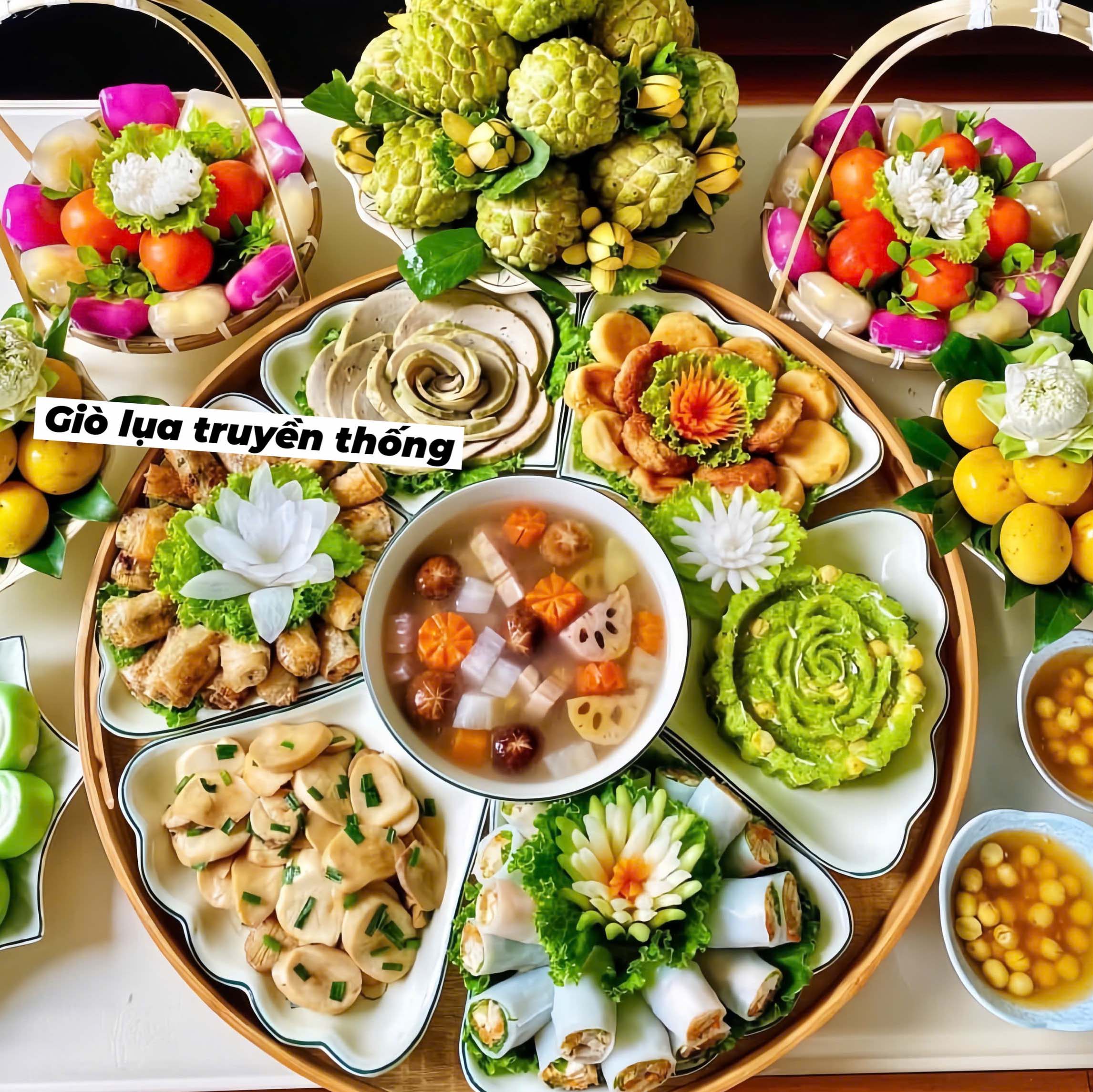 Bên cạnh lễ vật, hoa quả thì mâm cỗ này gồm các món truyền thống cũng rất được ưa chuộng bởi vì độ ngon cũng như công thức nấu quen thuộc. Các món ăn được bày trí theo phong cách cổ truyền, mang đậm màu sắc của văn hóa Việt. Những món ăn như: nem rán, xôi, giò lụa, nấm xào, canh rau củ và bánh. Ngoài ra, trong mâm cỗ còn có bánh cuốn tròn trịa, nõn nà được sếp gọn trong đĩa vô cùng bắt mắt