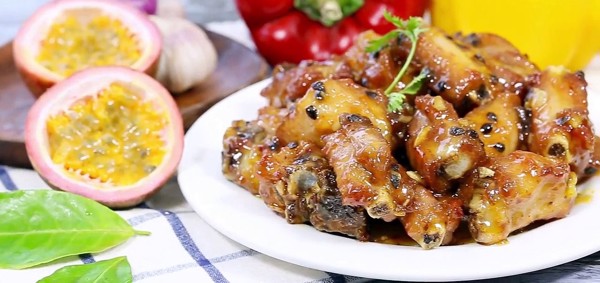 Đổ bát nước cốt chanh dây vào chảo sườn, thêm 1 thìa canh nước mắm, 1 thìa canh đường, 1 thìa cafe hạt nêm, 1 thìa cafe muối rồi rim trên lửa nhỏ.