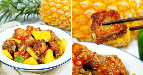 Đổ dứa và nước lọc vào xâm xấp mặt sườn rồi rim trên lửa nhỏ. Khi thấy hỗn hợp chuyển sang dạng sệt có màu vàng đẹp mắt thì tắt bếp, trút ra đĩa và ăn cùng cơm nóng.