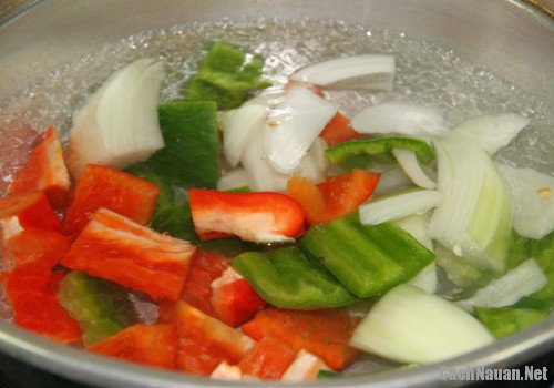 Ớt chuông, hành tây rửa sạch, thái thành lát vừa ăn. Chần sơ các nguyên liệu qua nước sôi để loại bỏ mùi hăng, nồng của ớt và hành.