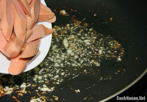Xúc xích thái lát xéo, phi thơm tỏi, cho xúc xích vào đảo đều.