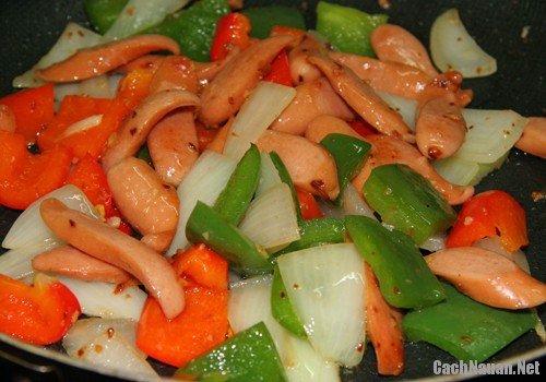 Khi xúc xích vừa săn lại thì cho ớt, hành tây vào xào đều. Nêm gia vị cho vừa ăn.
