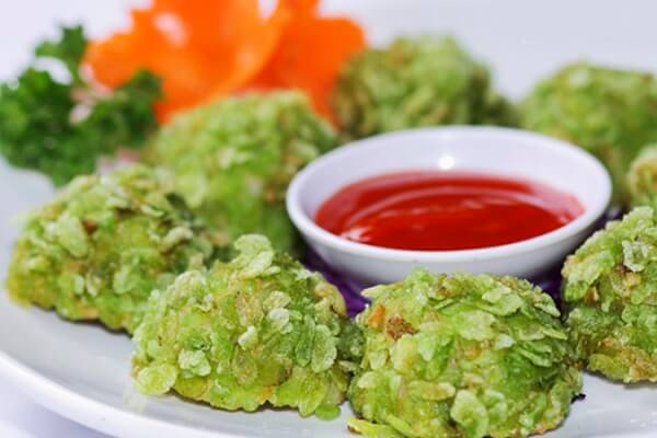 - Đổ cốm ra đĩa lòng sâu hoặc bát tô rồi lăn chả cá vào, sao cho cốm phủ kín và đều toàn bộ mặt viên chả cá. Dùng tay bóp nhẹ để lớp cốm bám vào viên cá.