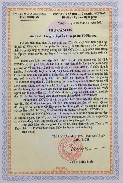 Thư cảm ơn Uỷ Ban MTTQVN Tỉnh Nghệ An cảm ơn Công Ty Cổ Phần Thực Phẩm Tứ Phương trong việc quyên góp, ủng hộ phòng chống đại dịch trên địa bàn tỉnh nhà.